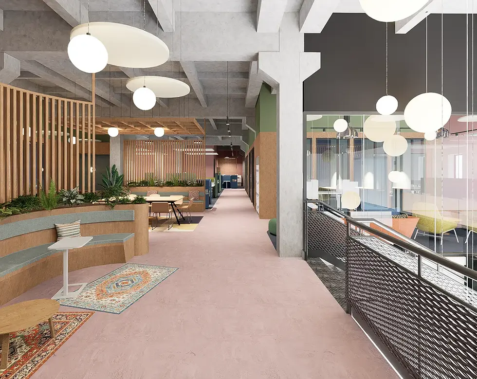 A contemporary coworking space set within an abandoned industrial building
